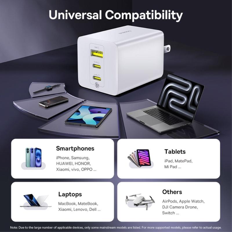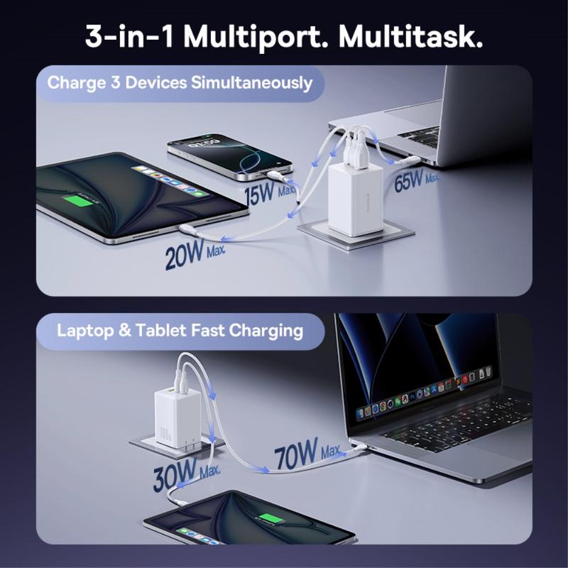 - Distribuição inteligente de energia: 70 W + 30 W em USB-C duplo, ou 65 W + 20 W + 15 W nas três portas