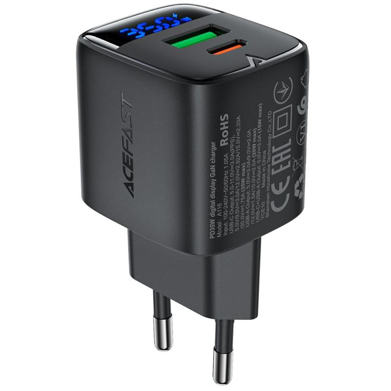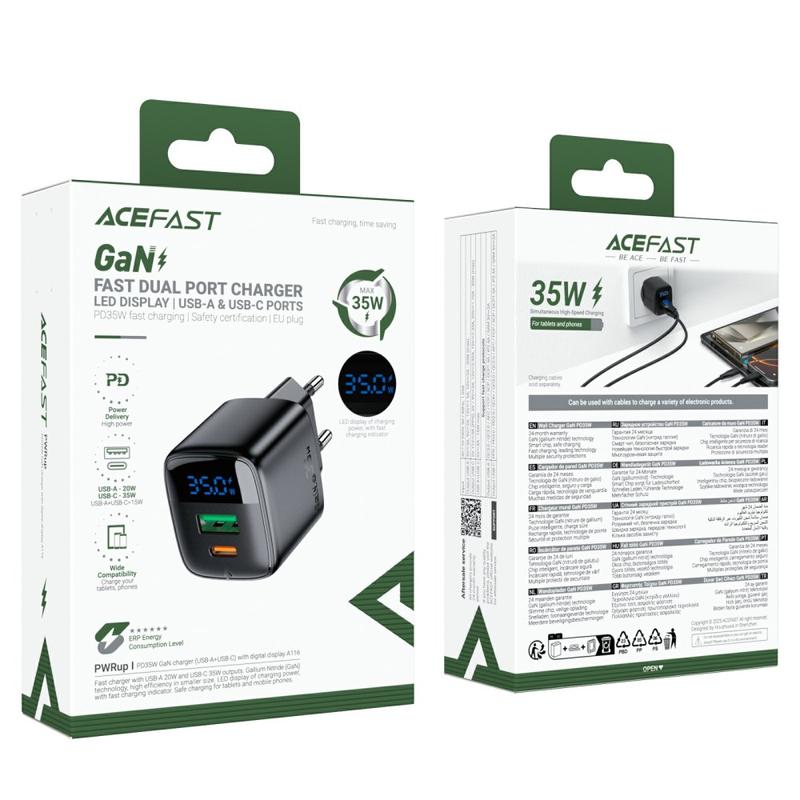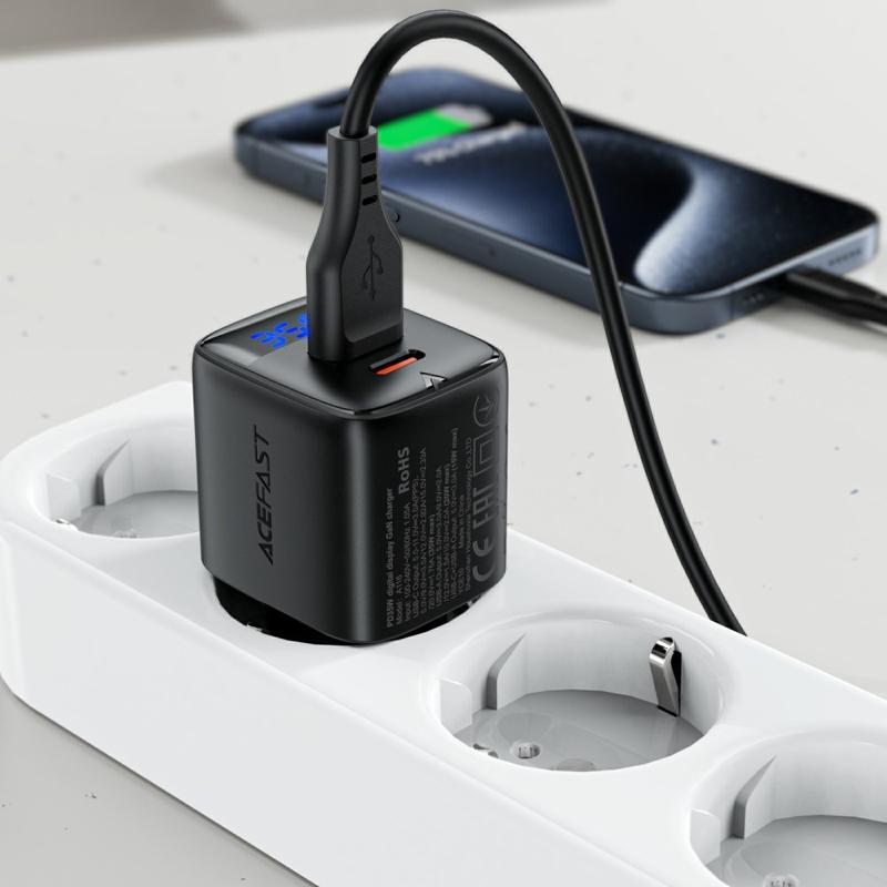 Carregador rápido de porta dupla Acefast A116 GaN 35W com ecrã LED de potência