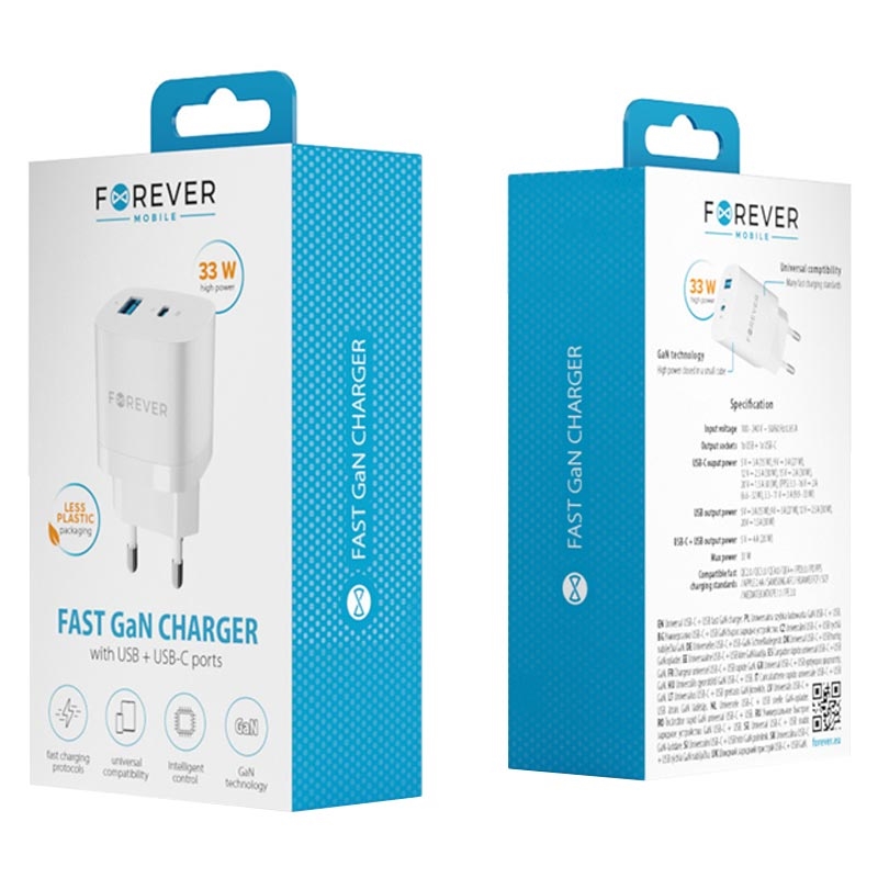 Carregador Rápido Forever GaN TC-05 - USB Quick Charge, USB-C Power Delivery, 33W, Ficha UE