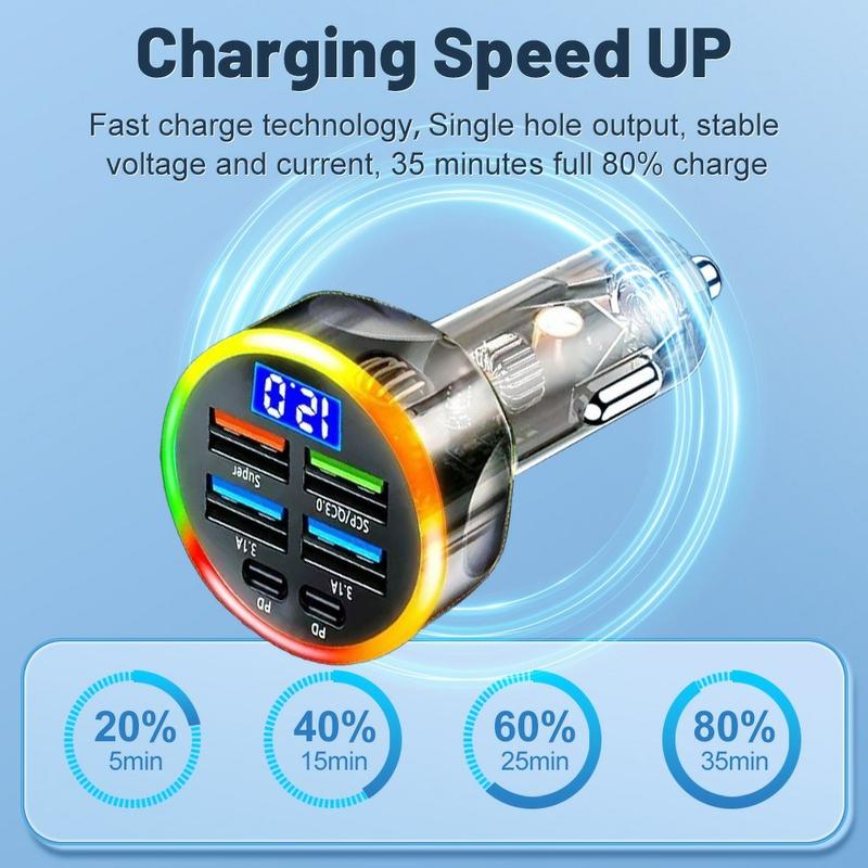 O design multi-porta 6 em 1, a capacidade de carregamento rápido e a construção durável fazem deste carregador de carro um acessório essencial para os condutores modernos. Seguro, potente e economizador de espaço, foi concebido para manter todos os dispositivos ligados em movimento.