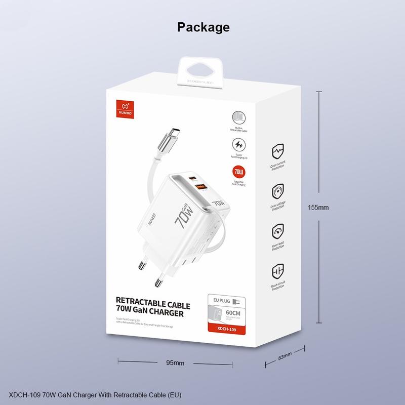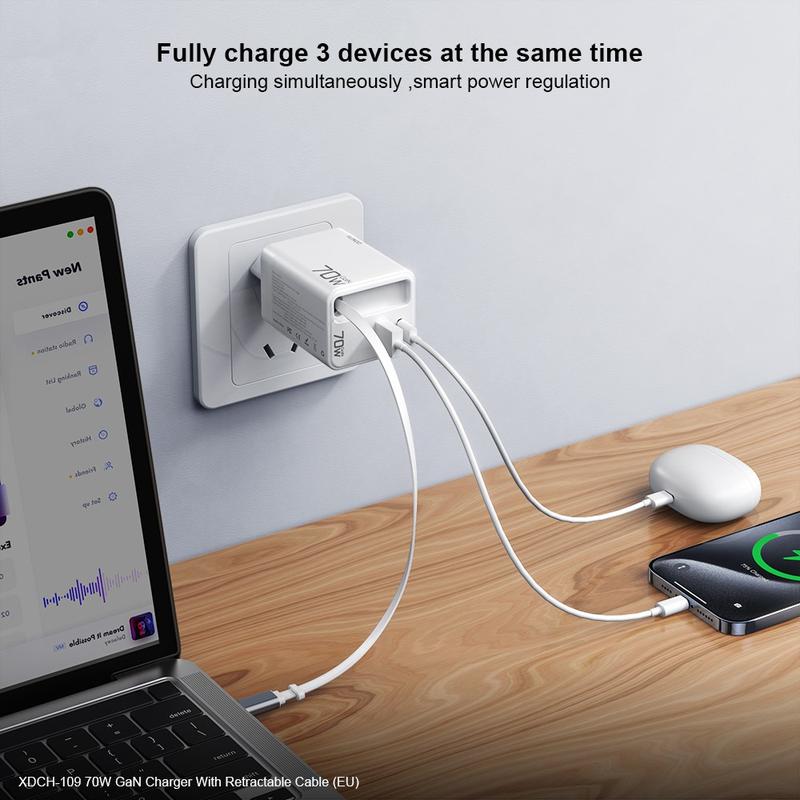 Carregador rápido Xundd XDCH-109 70W GaN - ficha UE, cabo USB-C retrátil de 60 cm e adaptador de corrente de 3 portas para computadores portáteis, tablets e smartphones