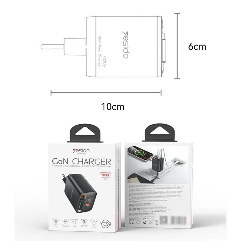 Carregador rápido Yesido YC99 40W com cabo retrátil Tipo C - Adaptador de carregamento USB-A e USB-C GaN - Ficha UE