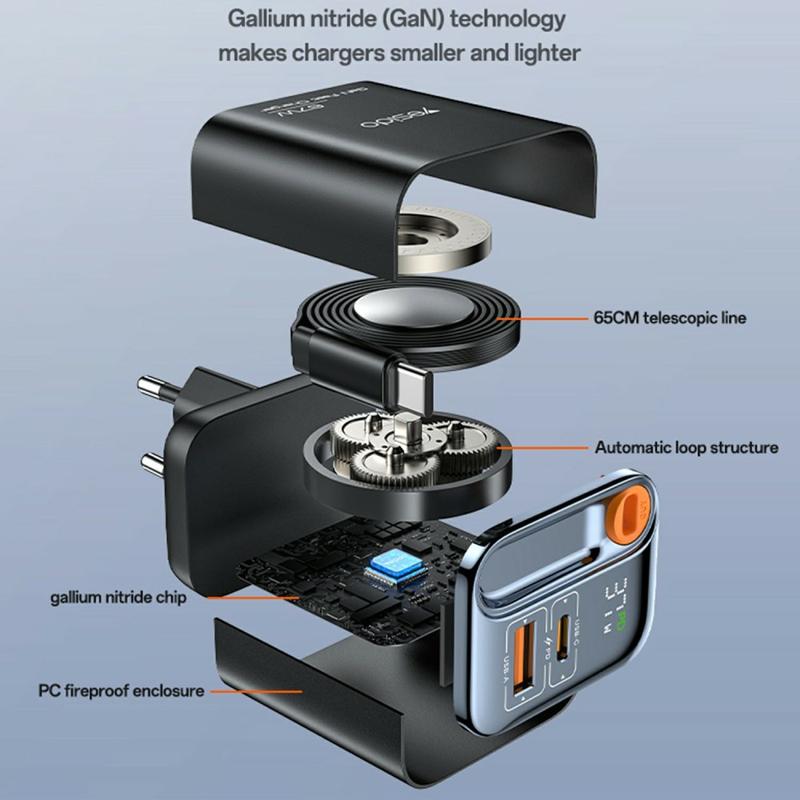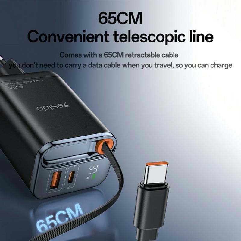 Carregador rápido Yesido YC100 67W com cabo retrátil Tipo C - Adaptador de carregamento USB-A e USB-C GaN - Ficha UE