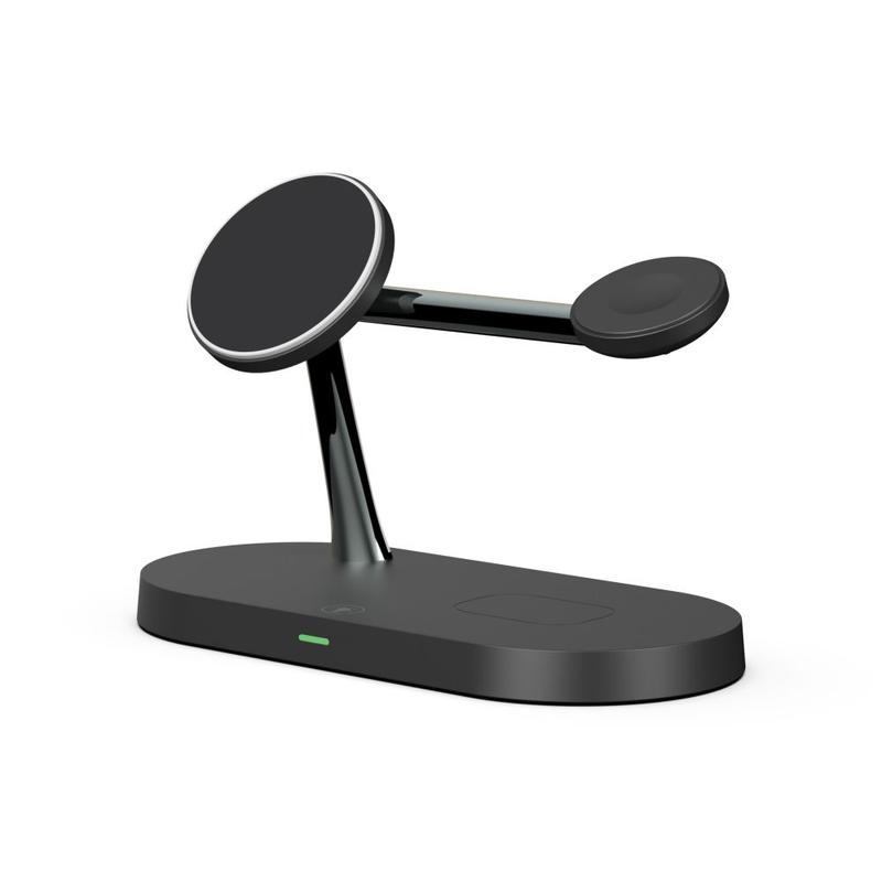 O carregador sem fios MagSafe magnético Tech-Protect A12 3 em 1 é um carregador indutivo multifuncional que permite carregar três dispositivos em simultâneo ou separadamente. É compatível com o iPhone com função MagSafe, Airpods e Apple Watch. O carregador apresenta um design elegante e funcional com um acabamento mate e uma lâmpada LED incorporada accionada por um botão tátil. O seu design modular permite várias configurações de carregamento e o íman proporciona uma fixação sólida nos dispositivos com uma base de borracha antiderrapante. O sistema de proteção evita o sobreaquecimento e a sobretensão, garantindo um carregamento seguro durante longos períodos.