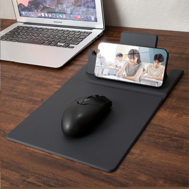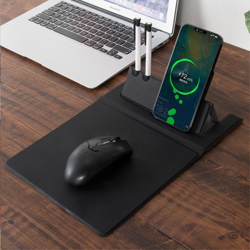 O tapete de rato em pele adopta um design três em um de carregador de telemóvel sem fios de 15W, suporte para caneta e tapete de rato