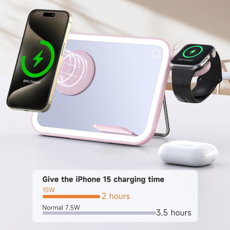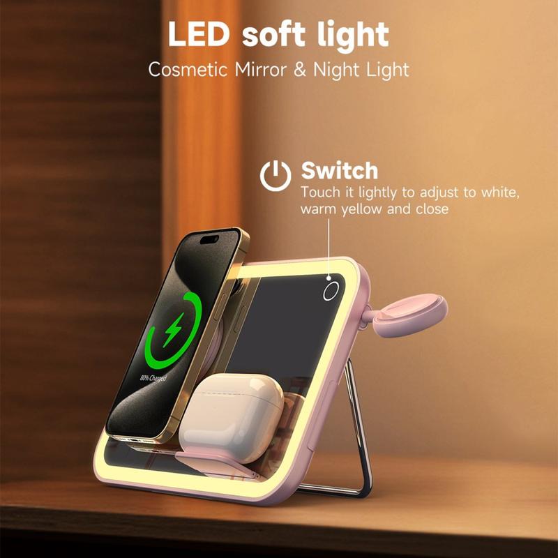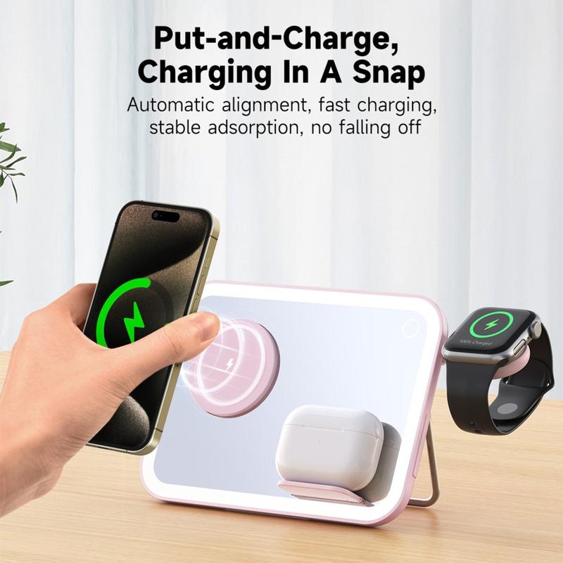 Carregador sem fios MagSafe 3 em 1 V22 com espelho de maquilhagem LED, luz nocturna - 10W/5W/3W