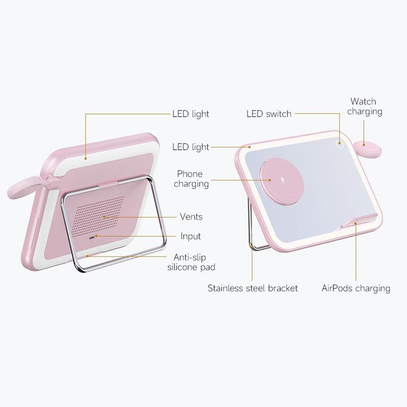 O carregador sem fios V22 3 em 1 é perfeito para quem procura combinar várias funcionalidades num único dispositivo elegante. Oferece a conveniência do carregamento sem fios, um espelho de maquilhagem LED brilhante e uma luz noturna, tudo numa unidade compacta.