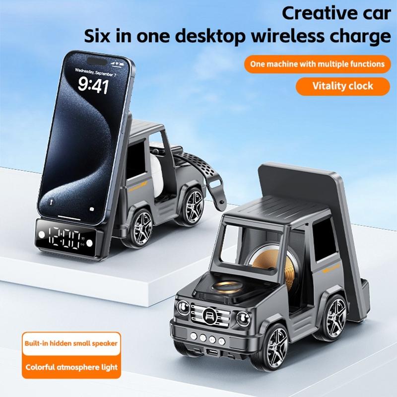 Carregador sem fios de 15W em forma de carro G63 com altifalante Bluetooth, relógio e luz ambiente