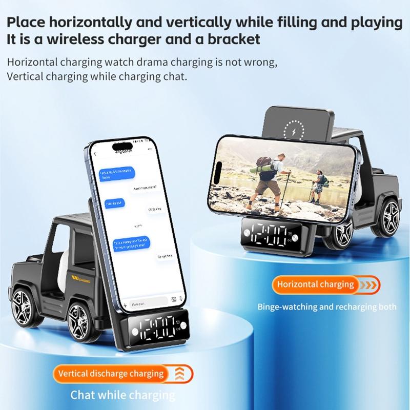 Revolucione o seu espaço de trabalho com o carregador sem fios em forma de carro G63. Com um carregamento sem fios rápido de 15W, este dispositivo multifuncional alimenta o seu smartphone, smartwatch e auriculares em simultâneo. O altifalante Bluetooth incorporado proporciona um som de alta qualidade, enquanto o relógio integrado com função de alarme ajuda-o a cumprir o horário. Com o seu design exclusivo de carro e iluminação ambiente, dá um toque moderno à sua secretária ou mesa de cabeceira.