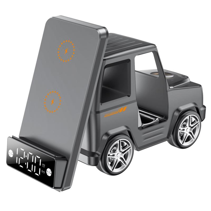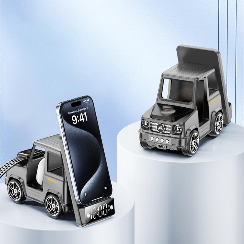 Carregador sem fios de 15W em forma de carro G63 com altifalante Bluetooth, relógio e luz ambiente