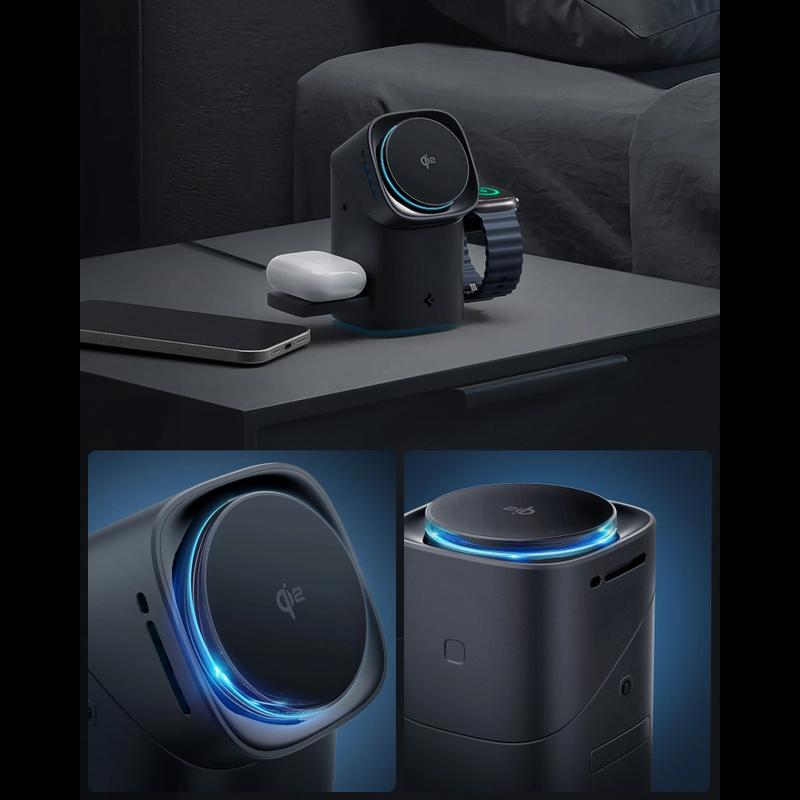 Carregador sem fios 3 em 1 Qi2 MagSafe Spigen Essential EF223MS - Suporte/carregador rotativo para iPhone, AirPods e base de carregamento para Apple Watch