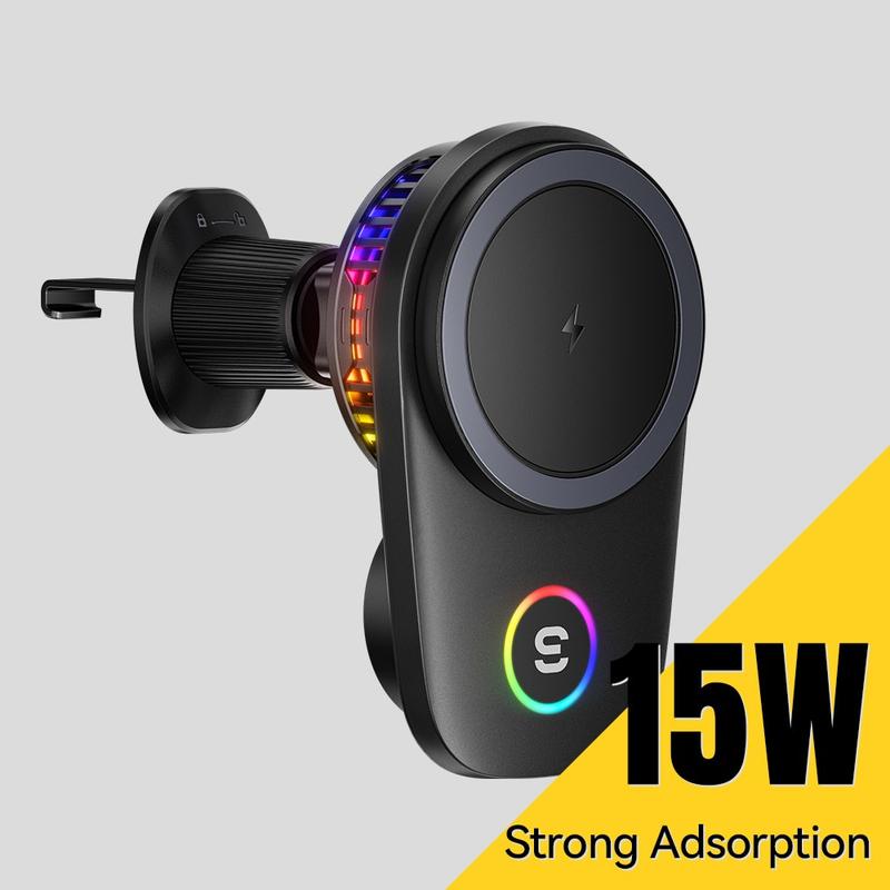 Carregador sem fios magnético Essager de 15W com suporte para automóvel, ventilador de refrigeração, luz RGB e fixação para a saída de ar - Compatível com MagSafe