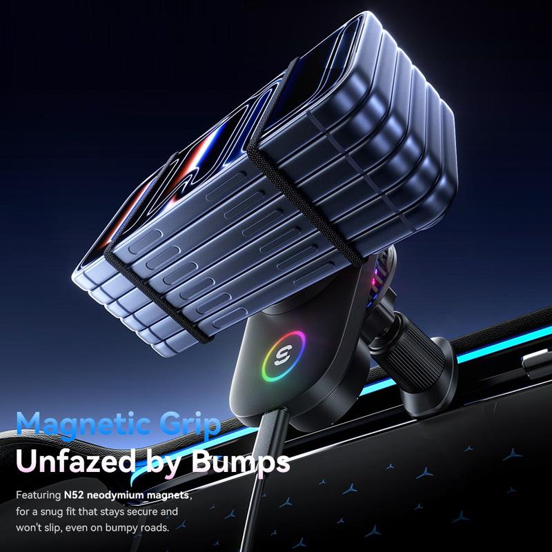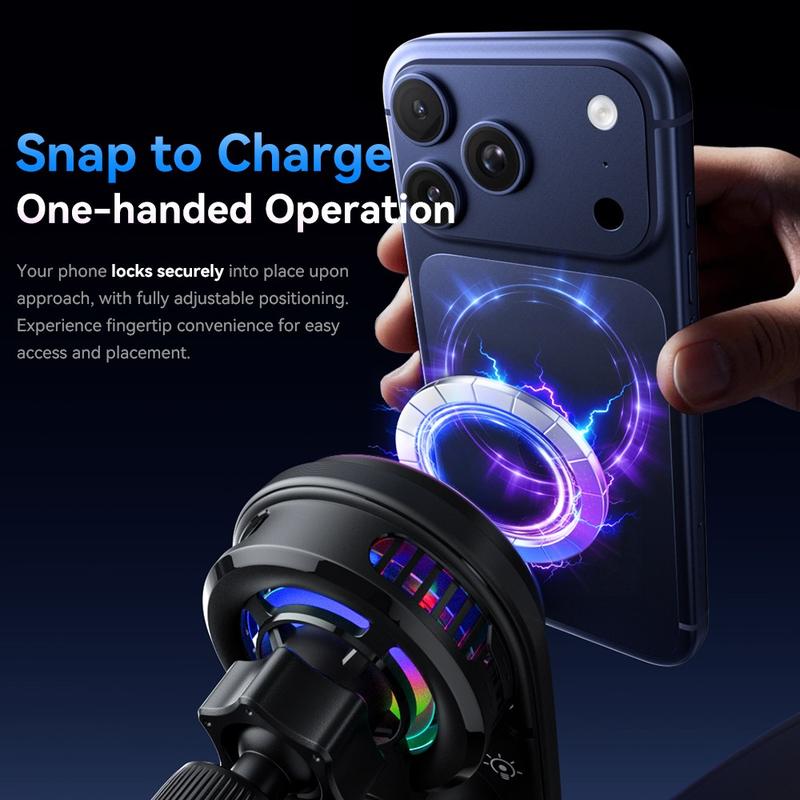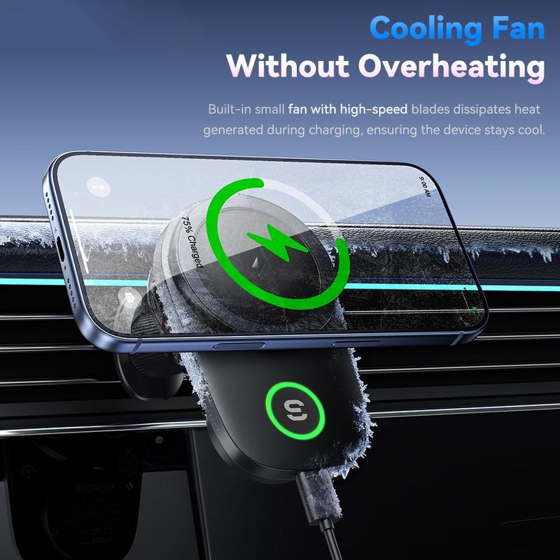 Isto é mais do que um suporte básico para carro. Oferece-lhe carregamento rápido, uma fixação magnética forte e uma forma mais segura de manter o seu telemóvel à vista enquanto conduz. A ventoinha de refrigeração integrada ajuda a manter um desempenho de carregamento mais estável, e o clipe de ventilação com bloqueio foi concebido para permanecer seguro mesmo em estradas irregulares. É uma atualização inteligente para quem deseja menos confusão de cabos, uma utilização mais fácil com uma só mão e uma configuração mais premium no interior do carro.