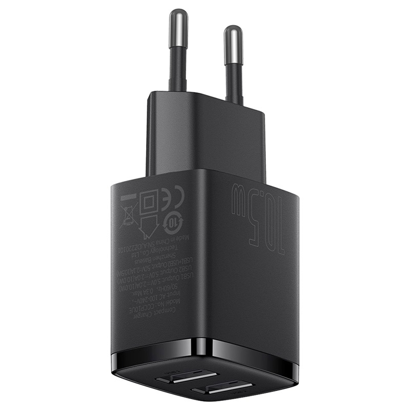 Carregador de Tomada Baseus Compact com 2 Portas USB - 10.5W - Ficha UE