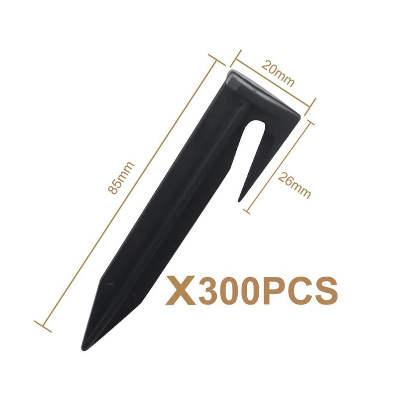 Proteja as instalações do seu jardim com este conjunto completo de 300 agrafos de plástico para o solo. Medindo 8,5 cm cada, estas estacas duradouras são ideais para fixar os fios de limite do cortador de relva, a orla do jardim e vários materiais de paisagismo, garantindo um espaço exterior limpo e ordenado.