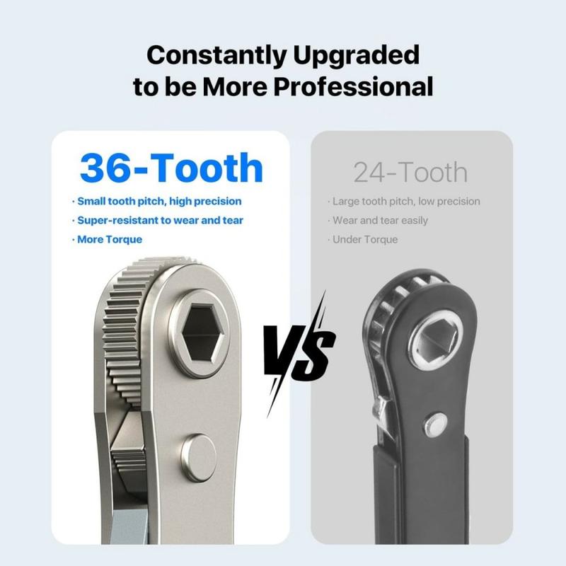 O design em ângulo reto facilita muito o trabalho em espaços estreitos onde uma chave de fendas padrão não consegue mover-se livremente. Com o seu mecanismo de catraca de 36 dentes, a ferramenta proporciona um movimento mais suave com um arco de oscilação menor, ajudando a melhorar o controlo e a reduzir a fadiga das mãos durante o uso repetido. Também pode ser utilizada no modo reto, oferecendo-lhe flexibilidade extra para tarefas de reparação mais convencionais.