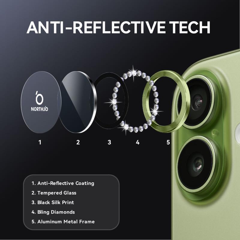 O protetor de lente com strass da NORTHJO oferece o melhor dos dois mundos - brilho premium e durabilidade de alta resistência. Melhora a aparência do seu telefone, mantendo a nitidez da fotografia profissional e a proteção diária.