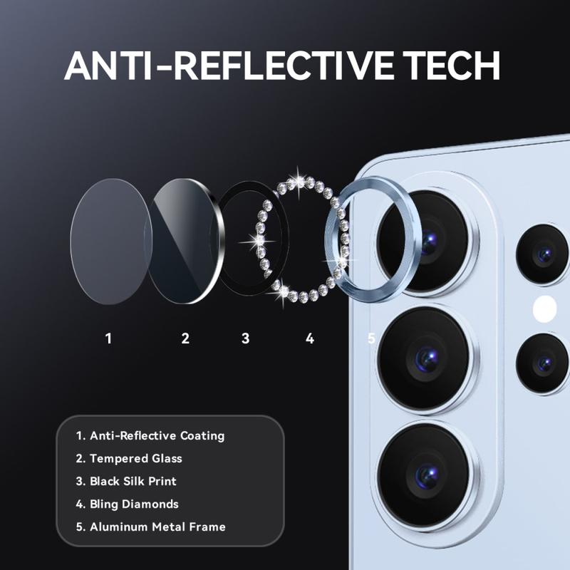Acrescente brilho e proteção ao seu Samsung Galaxy S26 Ultra com o Protetor da lente da câmara NORTHJO. Concebido com strass cintilantes e vidro temperado cortado com precisão, mantém a lente da câmara protegida contra riscos, poeira e impactos, ao mesmo tempo que dá um toque de elegância e luxo.