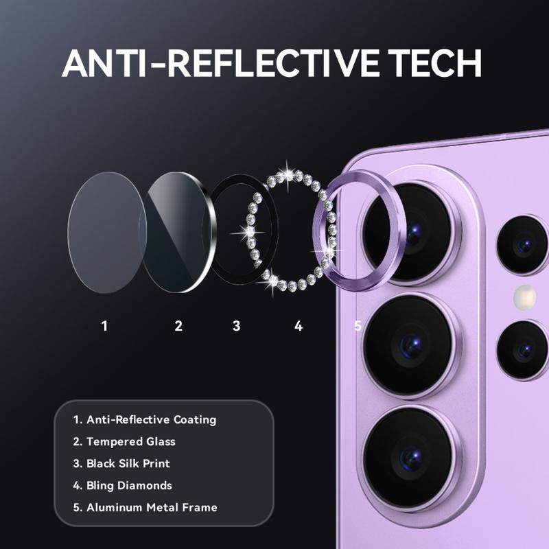 Acrescente brilho e proteção ao seu Samsung Galaxy S26 Ultra com o Protetor da lente da câmara NORTHJO. Concebido com strass cintilantes e vidro temperado cortado com precisão, mantém a lente da câmara protegida contra riscos, poeira e impactos, ao mesmo tempo que dá um toque de elegância e luxo.