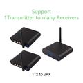 - Saída de um para dois - Um transmissor suporta dois receptores para reprodução simultânea em vários ecrãs.