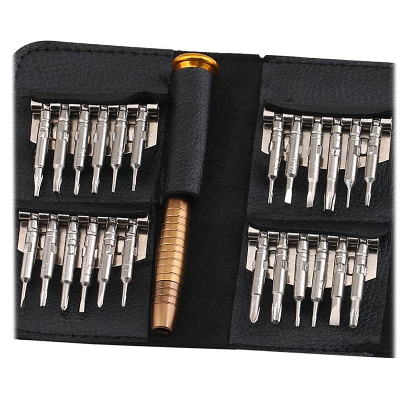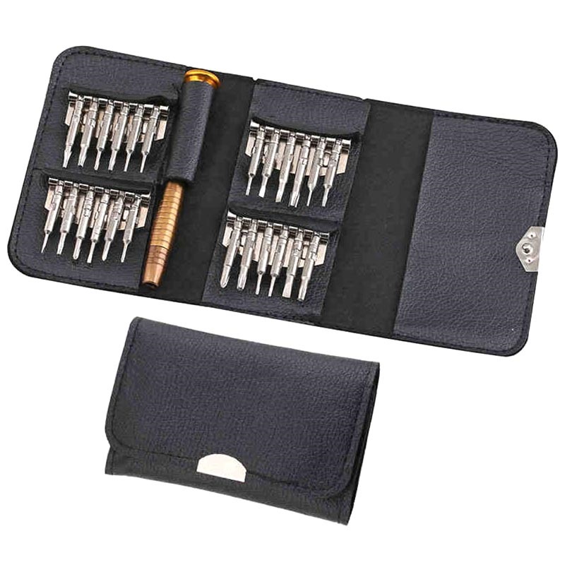 Este fantástico conjunto 25 em 1 de ferramentas de abertura, com chave de fendas multifuncional, irá ajudá-lo muito na montagem ou desmontagem dos seus dispositivos eletrónicos domésticos. Contém vinte e quatro cabeças de chave de fendas, que se adaptam a diferentes aparelhos. Este conjunto de ferramentas com chave de fendas é leve e portátil, e foi concebido para imitar a forma de uma carteira.