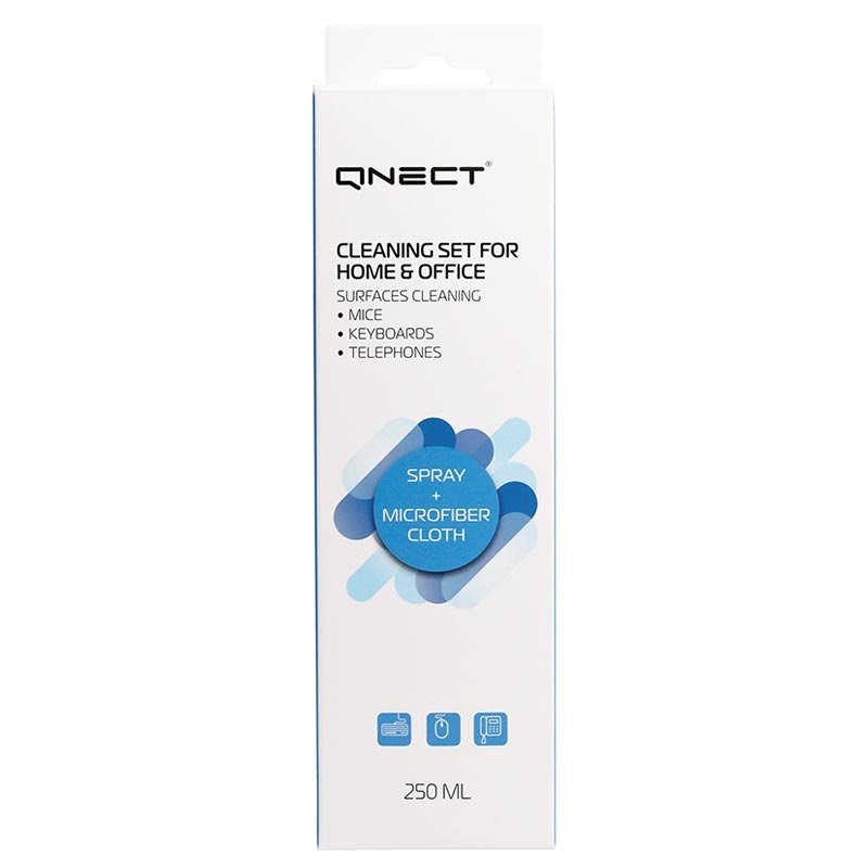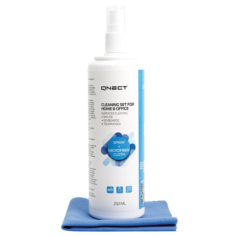 Mesmo se trabalha em casa ou no escritório, precisa de desinfetar a sua mesa, teclado, rato e outras peças plásticas. Conjunto de limpeza antibacteriana Qnect contém 250 ml de spray de desinfecção e pano de microfibra.