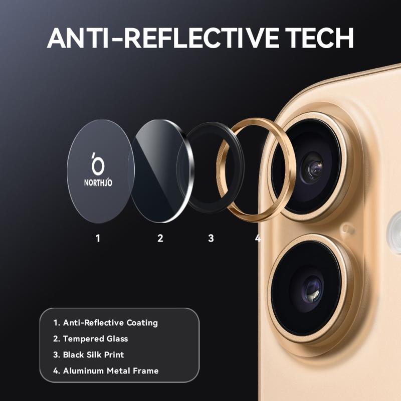 Melhore o seu iPhone 17 com o protetor da lente da câmara Northjo. Com um anel de alumínio com veios de CD, acrescenta um toque elegante e moderno ao seu iPhone 17, ao mesmo tempo que oferece uma proteção robusta. O vidro temperado 9H protege contra riscos, impactos e poeira, assegurando que a lente da câmara permanece cristalina. Com uma instalação fácil e sem ferramentas, pode aumentar a durabilidade e a estética do seu iPhone 17 em segundos.