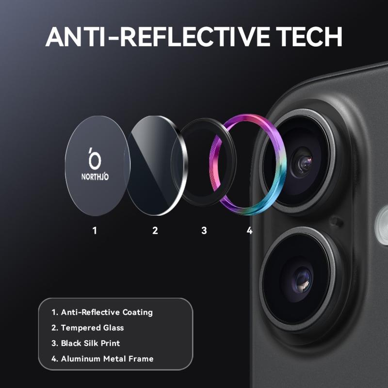 Melhore o seu iPhone 17 com o protetor da lente da câmara Northjo. Com um anel de alumínio com veios de CD, acrescenta um toque elegante e moderno ao seu iPhone 17, ao mesmo tempo que oferece uma proteção robusta. O vidro temperado 9H protege contra riscos, impactos e poeira, assegurando que a lente da câmara permanece cristalina. Com uma instalação fácil e sem ferramentas, pode aumentar a durabilidade e a estética do seu iPhone 17 em segundos.