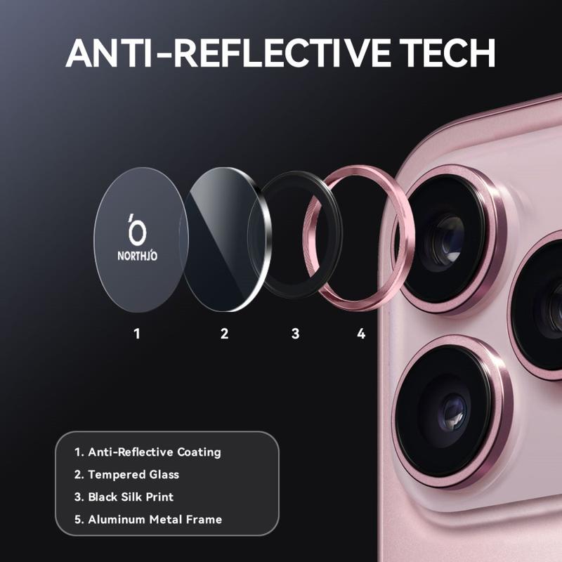 Melhore o seu iPhone 17 Pro, iPhone 17 Pro Max com o protetor da lente da câmara Northjo. Com um anel de alumínio com veios de CD, acrescenta um toque elegante e moderno ao seu iPhone 17 Pro, iPhone 17 Pro Max, ao mesmo tempo que oferece uma proteção robusta. O vidro temperado 9H protege contra riscos, impactos e poeira, assegurando que a lente da câmara permanece cristalina. Com uma instalação fácil e sem ferramentas, pode aumentar a durabilidade e a estética do seu iPhone 17 Pro, iPhone 17 Pro Max em segundos.