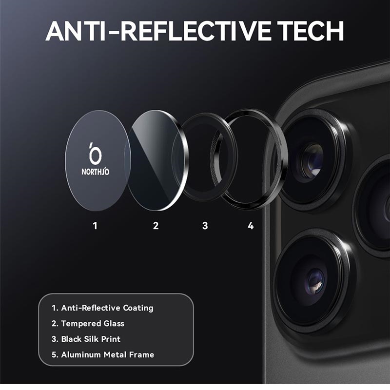 Melhore o seu iPhone 17 Pro, iPhone 17 Pro Max com o protetor da lente da câmara Northjo. Com um anel de alumínio com veios de CD, acrescenta um toque elegante e moderno ao seu iPhone 17 Pro, iPhone 17 Pro Max, ao mesmo tempo que oferece uma proteção robusta. O vidro temperado 9H protege contra riscos, impactos e poeira, assegurando que a lente da câmara permanece cristalina. Com uma instalação fácil e sem ferramentas, pode aumentar a durabilidade e a estética do seu iPhone 17 Pro, iPhone 17 Pro Max em segundos.