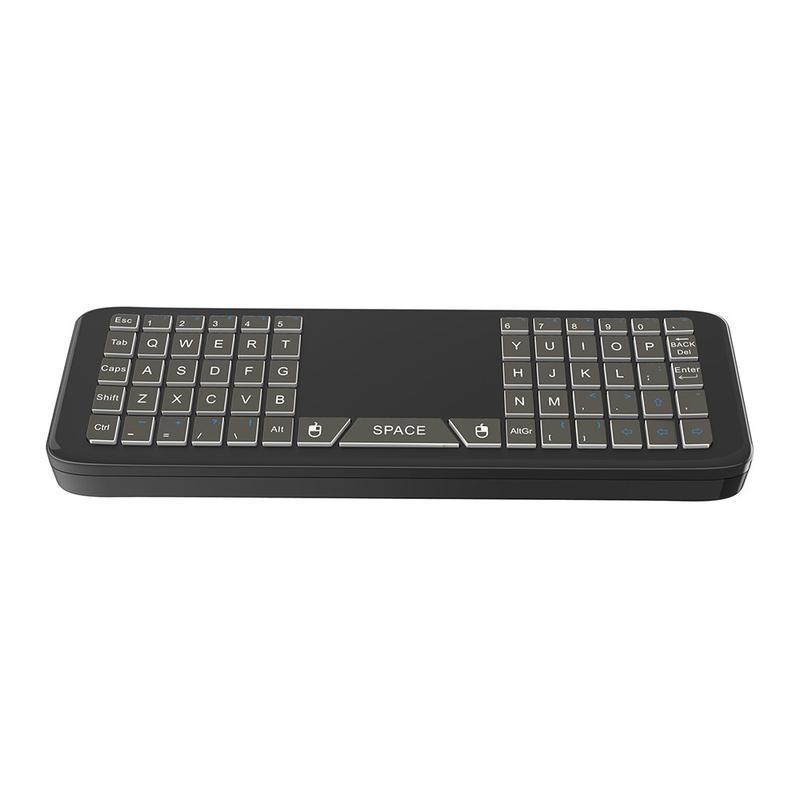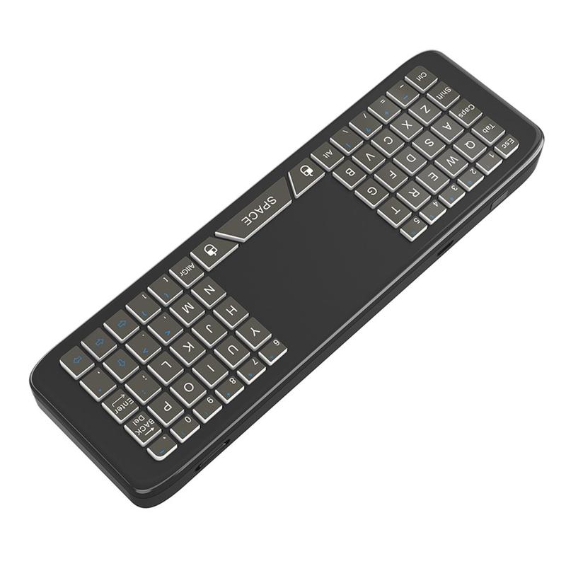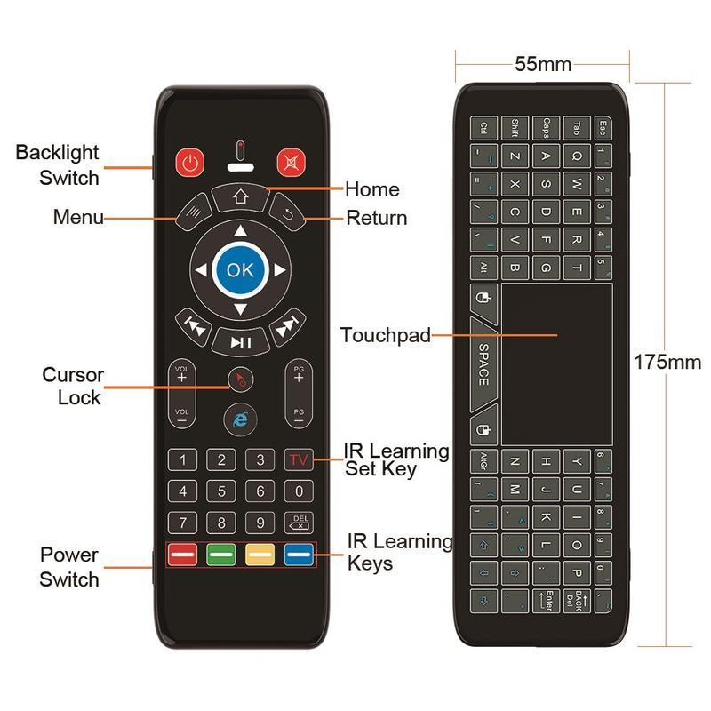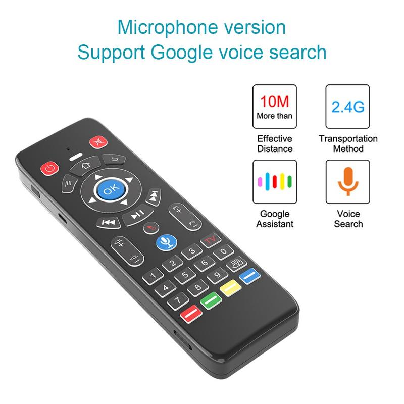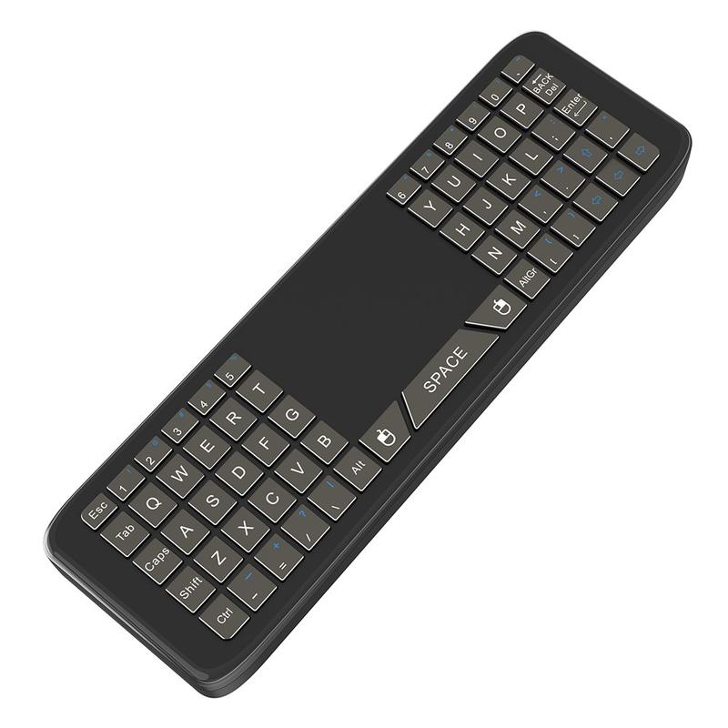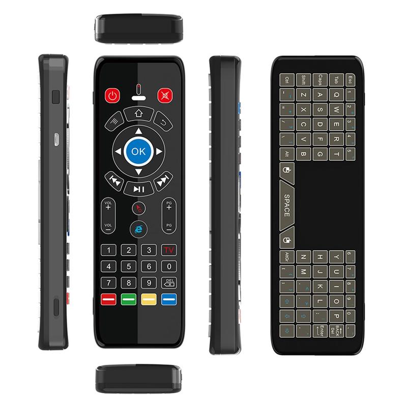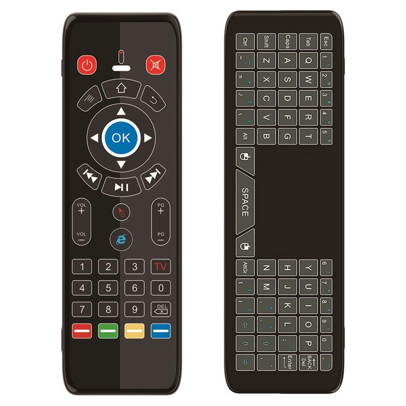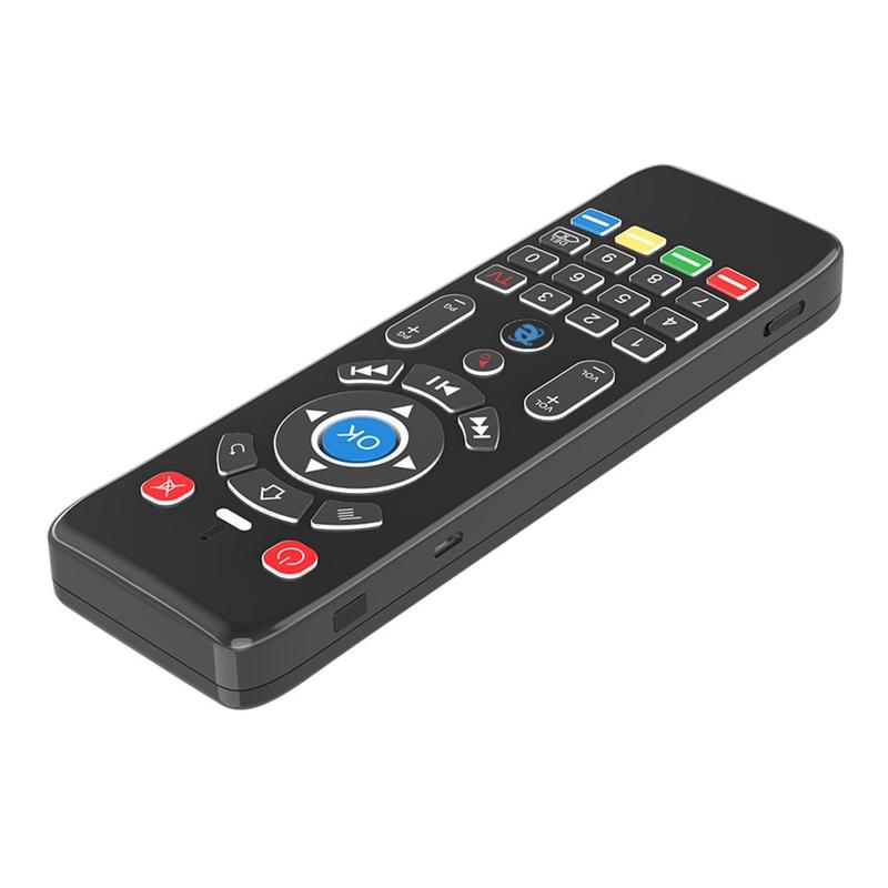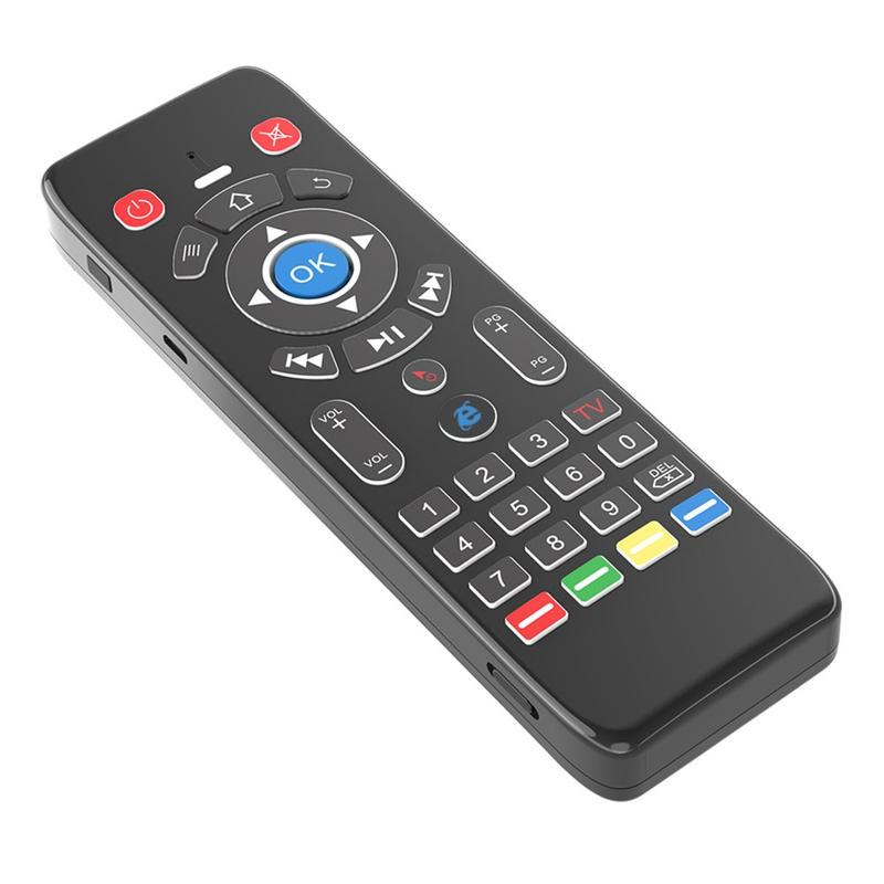O comando remoto sem fios T16+ combina vários métodos de controlo num único dispositivo compacto: rato aéreo com giroscópio, painel tátil, teclado QWERTY completo e aprendizagem IR de 5 teclas. Foi concebido para substituir vários controladores e simplificar a navegação em dispositivos inteligentes.