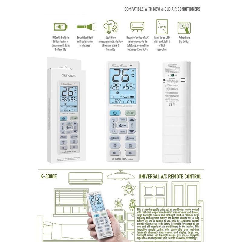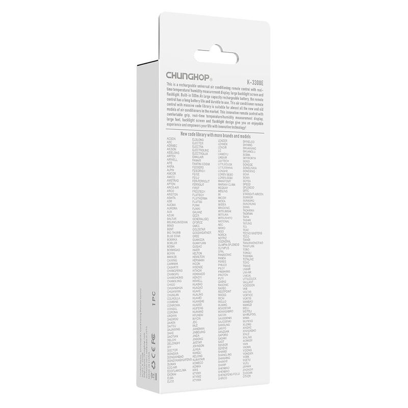 Assuma o controlo do seu clima interior com o Controlo Remoto Universal Recarregável para Ar Condicionado CHUNGHOP K-3308E. Concebido para ser emparelhado com várias marcas e modelos de AC, possui uma bateria recarregável incorporada, reduzindo a necessidade de comprar constantemente peças de substituição. O visor integrado de temperatura e humidade fornece actualizações em tempo real, ajudando-o a manter um ambiente confortável em todos os momentos.