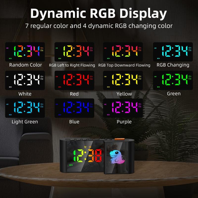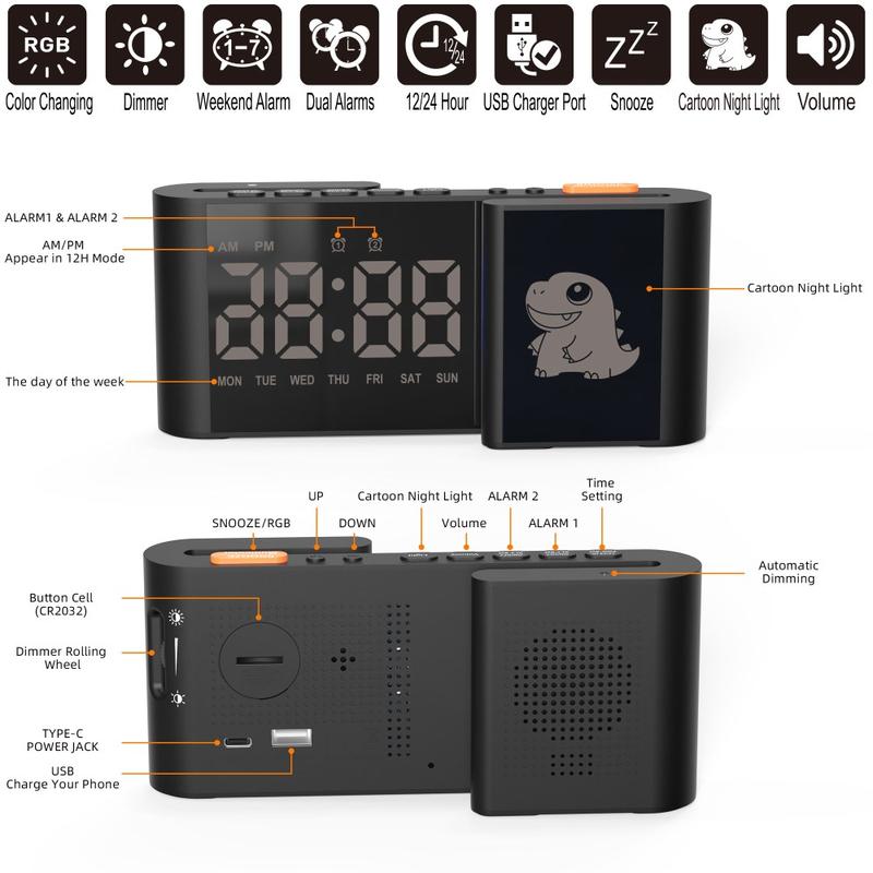 Despertador para crianças com ecrã duplo para animais de desenho animado em forma de S RGB com ecrã de 12/24 horas, luz nocturna