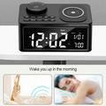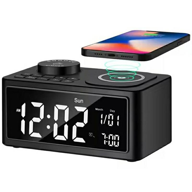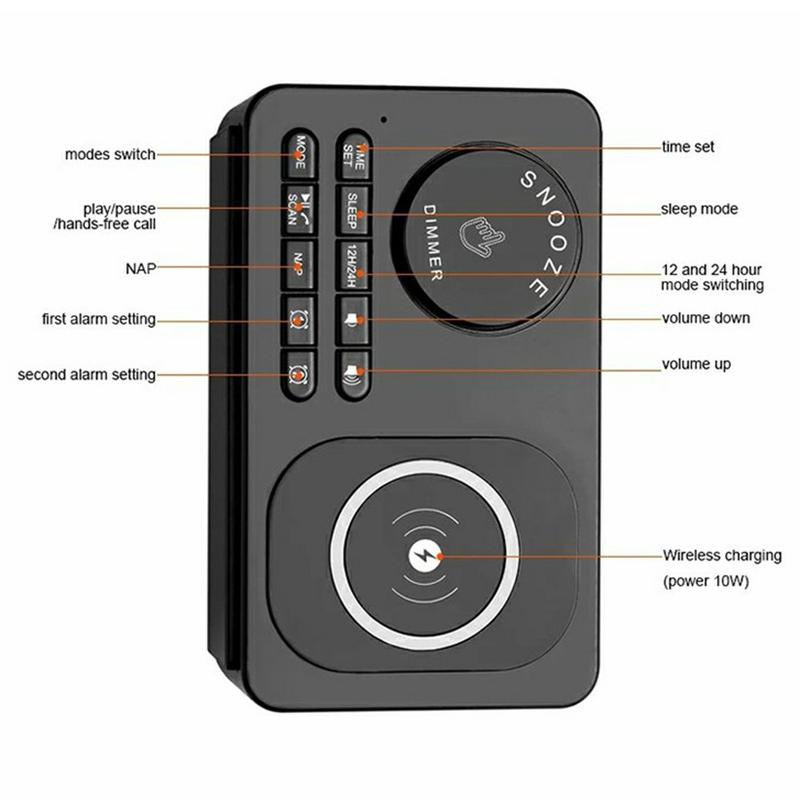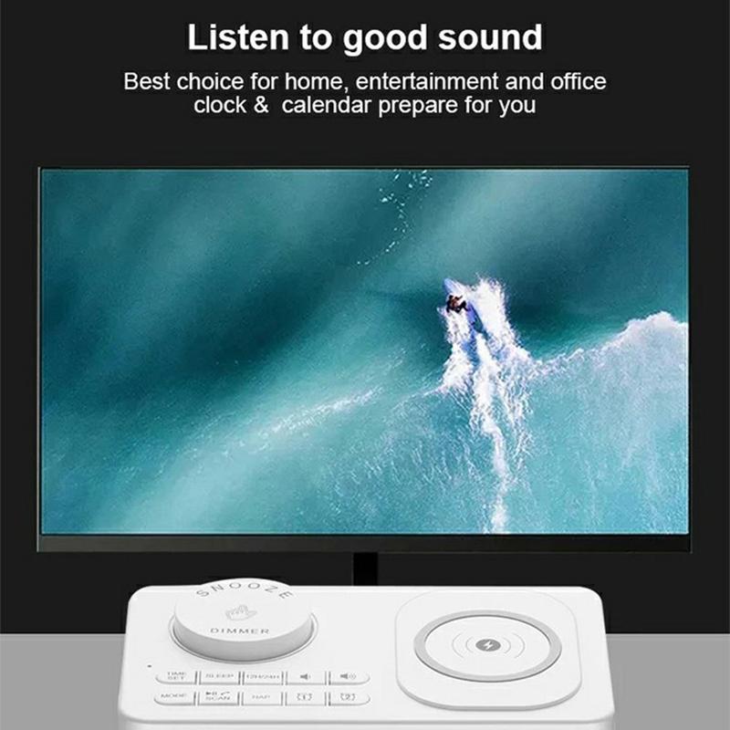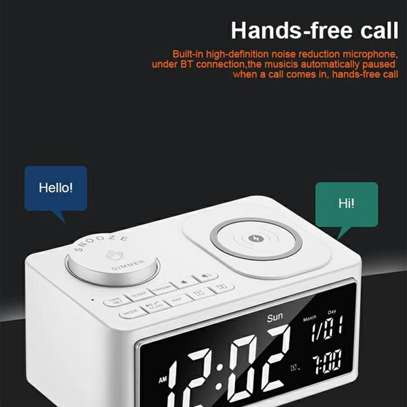 Melhore a sua cabeceira ou espaço de trabalho com o rádio-relógio multifunções com altifalante Bluetooth e carregamento sem fios H7. Este elegante dispositivo tudo-em-um combina um carregador sem fios, uma coluna Bluetooth, um rádio FM e um despertador inteligente, oferecendo comodidade e eficiência num design compacto.