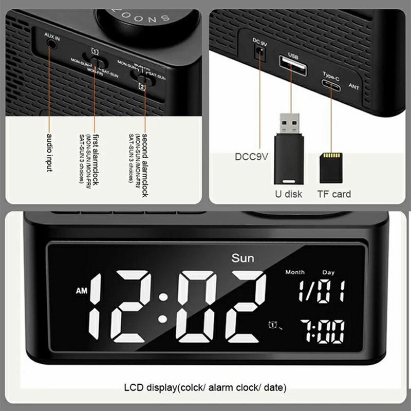 - Alarmes duplos personalizáveis: Defina dois alarmes separados com opções de toques incorporados, rádio FM ou reprodução de música USB. Inclui uma definição de alarme apenas para o dia da semana para conveniência personalizada.