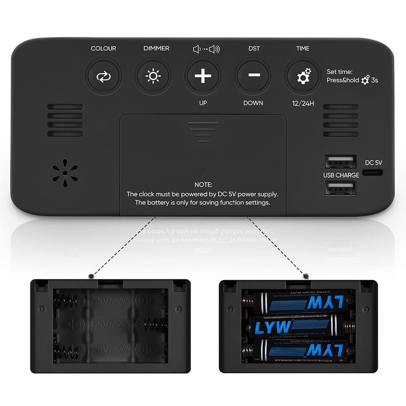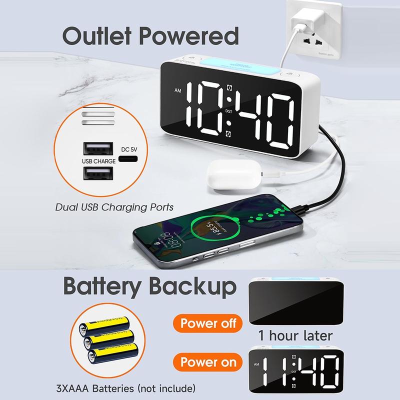 - Caraterísticas adicionais: Inclui uma função de snooze de 9 minutos, formato de hora de 12/24 horas, ajuste do horário de verão e duas portas de saída USB DC 5V/1A para carregar com segurança os seus dispositivos ao lado da cama.