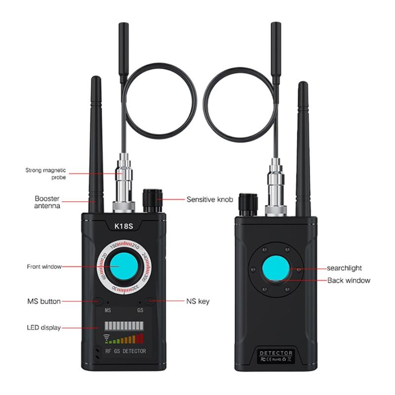 Os detectores RF, como o K18s, utilizam a digitalização por radiofrequência e filtros de lentes ópticas para identificar dispositivos ocultos. O método de reflexão da luz vermelha utilizado na deteção de lentes é semelhante às técnicas aplicadas em operações profissionais de contra-vigilância.
