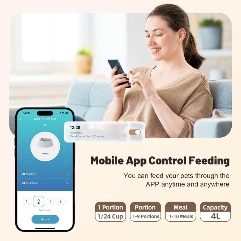 - Controlo WiFi e App: Defina horários de alimentação e tamanhos de porções remotamente usando um aplicativo de smartphone compatível, perfeito para proprietários ocupados ou em viagem.