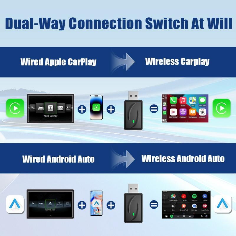 Actualize o seu automóvel com o adaptador 2-em-1 sem fios para CarPlay e Android Auto, transformando as ligações tradicionais com fios em experiências sem fios perfeitas. Desfrute de mais liberdade, menos confusão e uma condução mais segura - tudo sem cabos emaranhados.