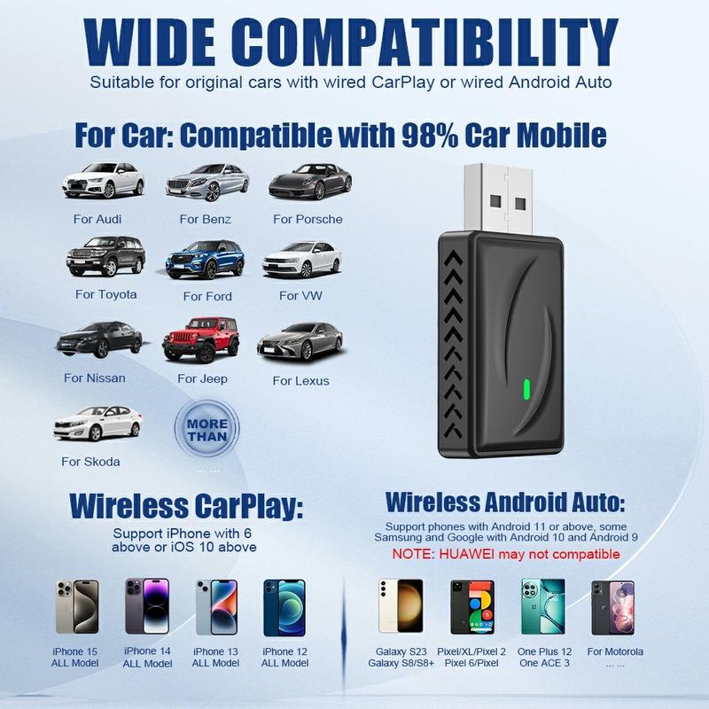 Compatível com CarPlay sem fios e Android Auto sem fios, este adaptador é perfeito para famílias com utilizadores mistos de smartphones. Alterne sem esforço entre dispositivos iPhone e Android, dependendo de quem está a conduzir.