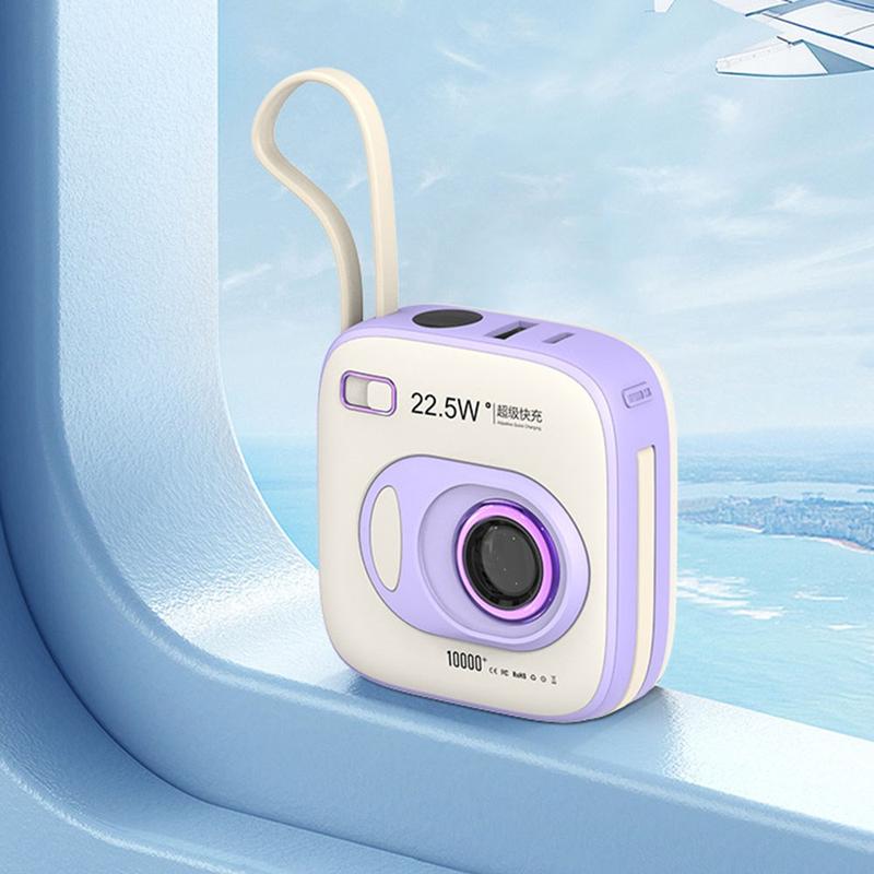 E52 10000mAh Mini Power Bank com cabo Carregador de telemóvel portátil em forma de câmara Bateria externa - Roxo