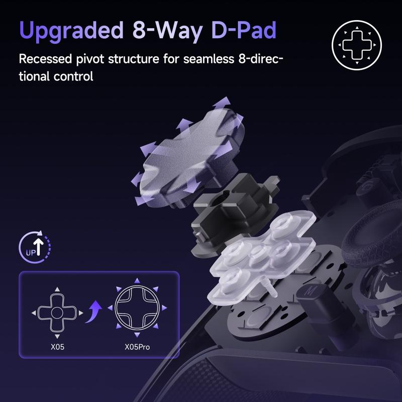 Os joysticks de efeito Hall utilizam sensores magnéticos em vez de contacto físico, eliminando o desgaste e a deriva - uma caraterística frequentemente reservada a controladores profissionais de topo de gama, agora disponível no X05Pro para uma precisão e durabilidade a longo prazo.