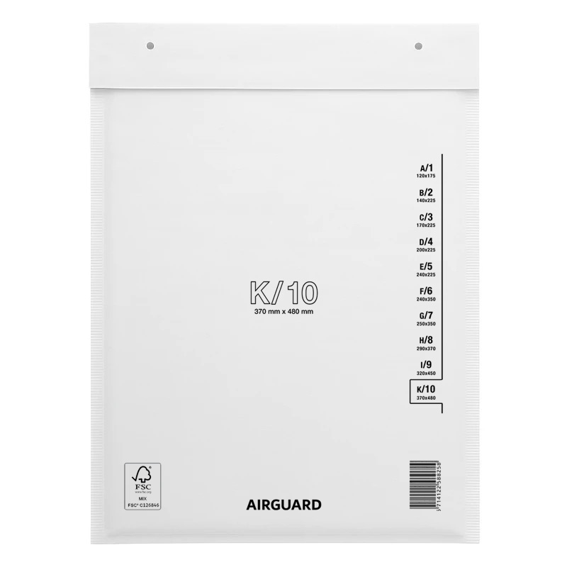 Envelope almofadado com bolha AirGuard K10 - Dimensões internas: 345x455mm, Dimensões Externas: 370x480mm