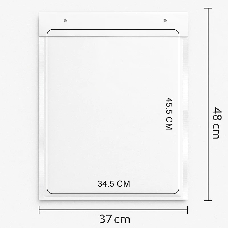 O envelope adapta-se ao tamanho K10 e tem dimensões externas de 370x480mm e dimensões internas de 345x455mm.