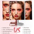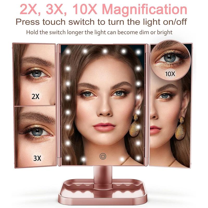 Espelho de maquilhagem dobrável de 3 lados com 22 luzes LED - Espelho de maquilhagem com ampliação 1X/2X/3X/10X
