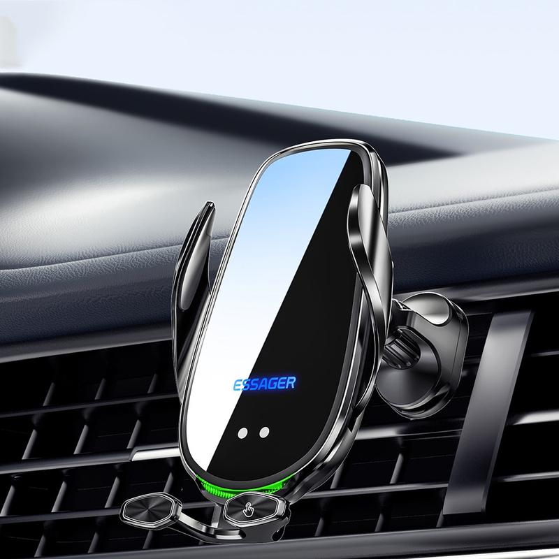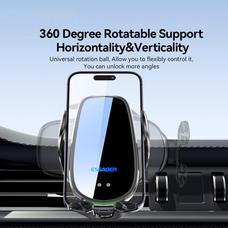 ESSAGER 15W Carregador sem fios inteligente para automóvel Suporte para telemóvel no veículo Suporte para telemóvel no respiradouro com luz ambiente