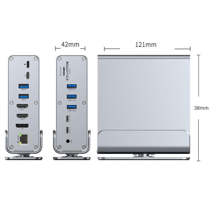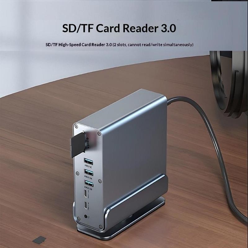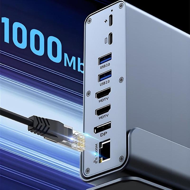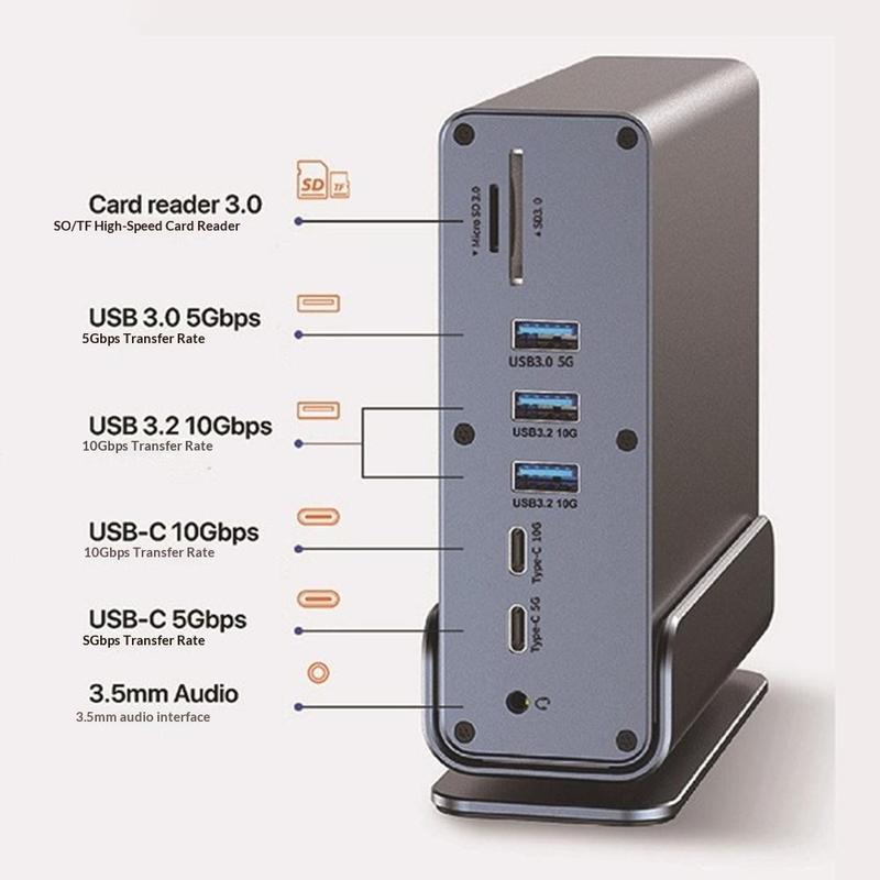 - Expansão 15 em 1: portas USB, vídeo triplo, leitor de cartões SD/TF, Ethernet e áudio de 3,5 mm num único hub