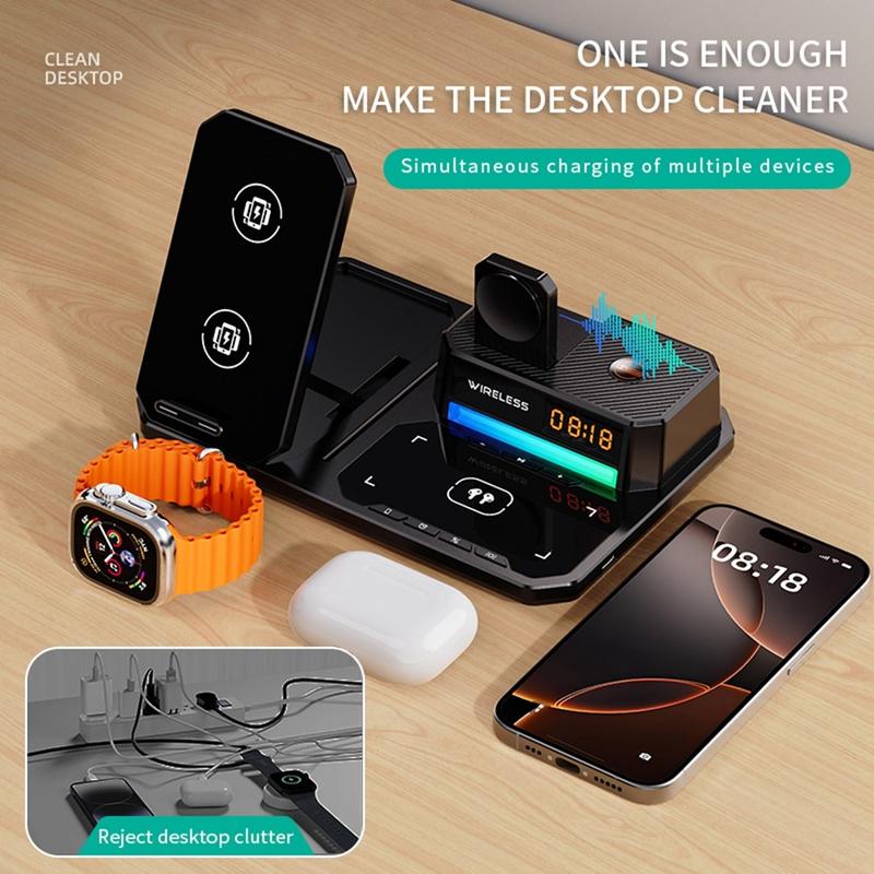 - Design multifuncional 6 em 1: Um gadget versátil que carrega telefones, fones de ouvido e smartwatches, oferecendo um suporte para telefone, alto-falante Bluetooth, relógio digital e iluminação ambiente.