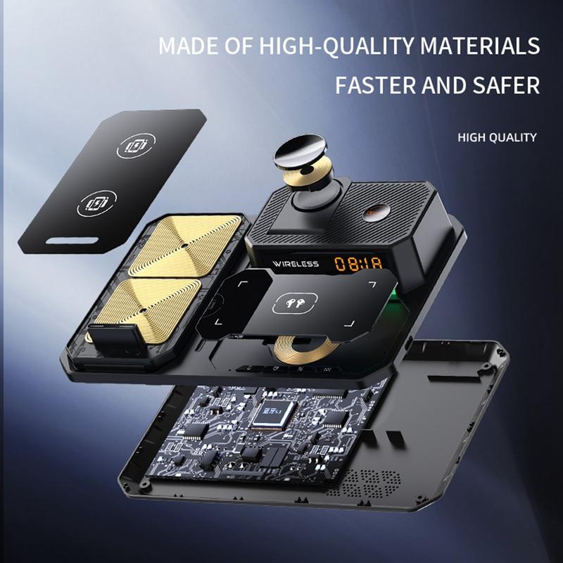- Carregamento rápido sem fios: Suporta até 15 W para telemóveis, 5 W para auriculares e 3 W para smartwatches, garantindo um fornecimento de energia eficiente para dispositivos compatíveis.