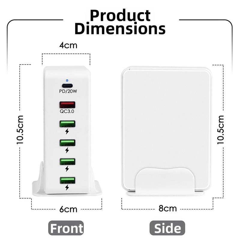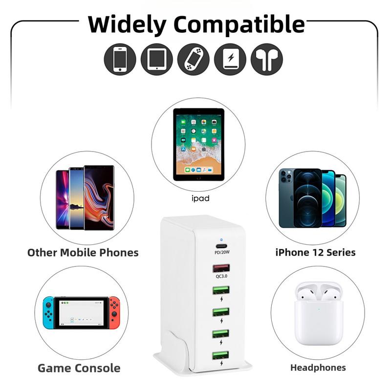 Com uma porta PD, uma porta QC3.0 e quatro saídas USB-A adicionais, pode carregar vários dispositivos em simultâneo - perfeito para estações de trabalho, famílias ou viajantes que transportam vários gadgets.